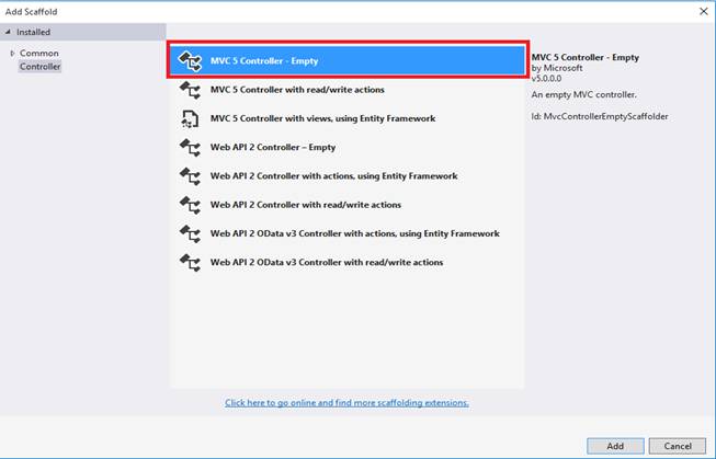 Go to the controllers folder-> Add-> Controller-> Select MVC 5 Controller Empty->Add.